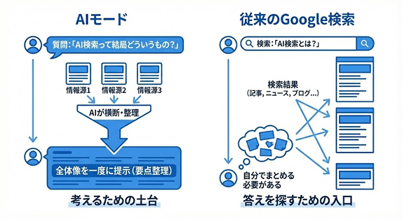 AIモードを理解するうえで、最初に押さえておくべきことがあります。それは、従来のGoogle検索と「役割分担」が変わったという点です。