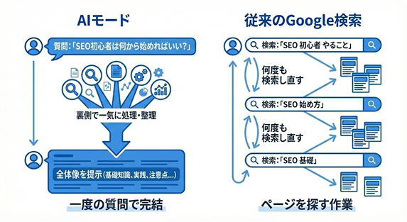 そこから2〜3ページを開き、「だいたいこういうことか」と自分でまとめる必要がありました。AIモードでは、この「まとめる前段階」をAIが引き受けます。