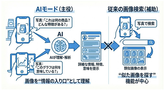 従来の画像検索は、「似た画像を探す」機能が中心でした。AIモードでは、画像を「情報の入り口」として理解するという使い方に変わっています。