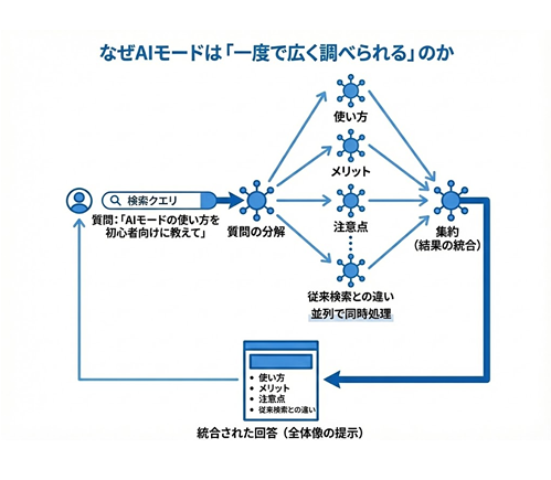 Google自身も、AIモードについて「複数の観点を同時に調べ、統合した回答を提供する」という考え方を公式に示しています。