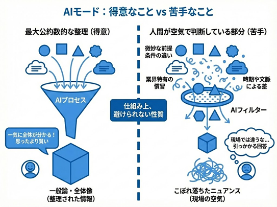 これはAIモードの欠点というより、仕組み上、避けられない性質です。AIモードは、複数の情報を横断的に集め、最大公約数的に整理することは得意です。