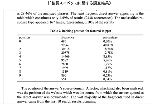過去の研究では、「強調スニペット」の 48% は検索結果の最上位ページから抽出されているという分析もあります。