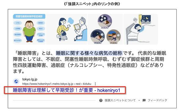 「強調スニペット」は、クエリと一致する 「単一のページの一部」 を抜き出して表示する方法であり、原則的にはそのページへのリンクと出典が明示されます。