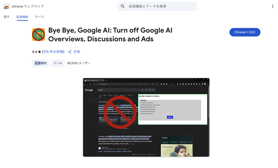 デスクトップ版のGoogle Chromeを使っている場合、「AIによる概要」を自動で隠すための便利な拡張機能が登場しています。代表的なのが 「Hide Google AI Overviews」 や 「Bye Bye, Google AI Overviews」 といったChromeウェブストアで公開されている拡張機能です。