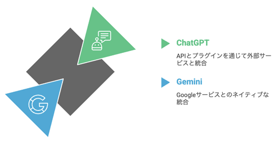 インフラ面でも両者には違いがあります。ChatGPTはAPI・プラグイン連携・外部サービスとの統合によってエコシステムを広げていますが、Geminiは最初からGmail、Googleドキュメント、YouTube、AndroidといったGoogleサービス全体と密接に連動することを前提にしています。これにより、検索・広告・クラウド・プロダクティビティツールを横断する形でAI体験を提供できる点が、Geminiの大きな特徴といえます。