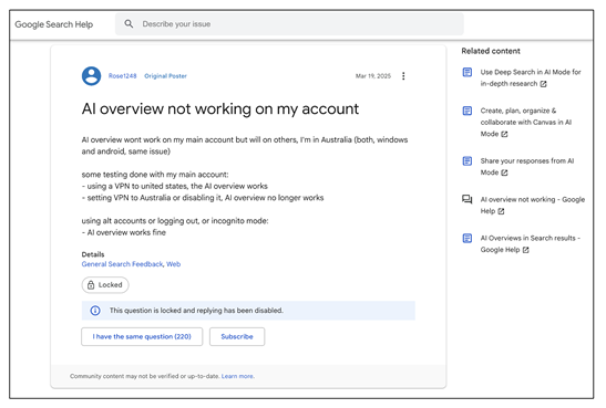 また、Google のヘルプ コミュニティには「AI Overviews(「AIによる概要」) が私のアカウントで機能しない」「Incognito モードだと 「AIによる概要」が出ない」「ログインしていても表示が出ない」などの相談が複数投稿されています。