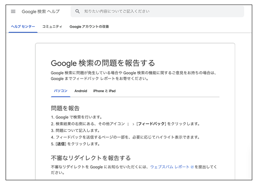 | E フィードバック送信 | Google の「フィードバックを送信」機能で問題を報告 | Google 側の改善材料となる可能性がある |