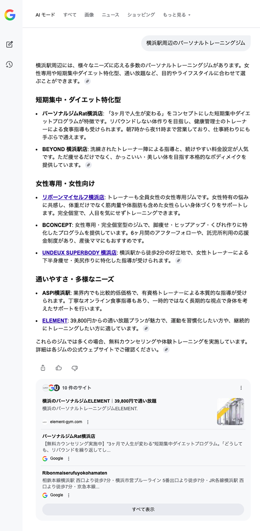 AIモードで「横浜駅周辺のパーソナルトレーニングジム」で検索した時に上位表示されるサイトの条件