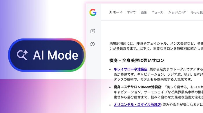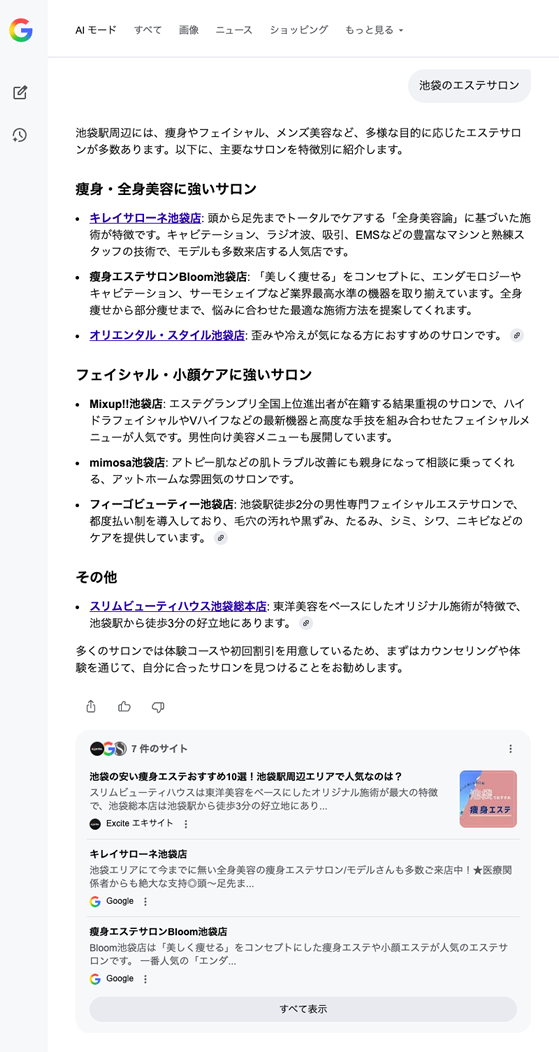 HOME > AI活用とAEO・AIO > AIモードで「池袋のエステサロン」と検索した時に表示される条件