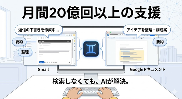 Geminiは検索の外でも使われるAIです。Gmailやドキュメントの中で、文章を要約したり、下書きを作ったり、考えを整理したりする場面が急速に増えています。Googleの公式発表では、Geminiによる支援は月に20億回規模に達しているとされています。これは、ユーザーが検索結果を見る前、あるいは検索をしないまま、AIとやり取りを終える場面が増えていることを意味します。
