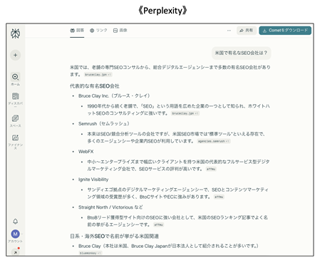一方のPerplexityは、使ってみるとすぐに「これは検索の未来だ」と感じるツールです。回答のすぐ下に出典URLが並ぶので、SEOの調査や海外の最新動向を追うときに非常に助かります。特に私はGoogleのAIモードや米国SEO業界の論文を常にチェックしていますが、Perplexityは記事を横断的に調べてエビデンス付きで情報を返してくれるので、情報の信頼性を確かめたいときには欠かせません。また、ChatGPTよりも「情報探索力」が強い印象があり、調査リサーチ系の業務では大きな時短効果を感じます。