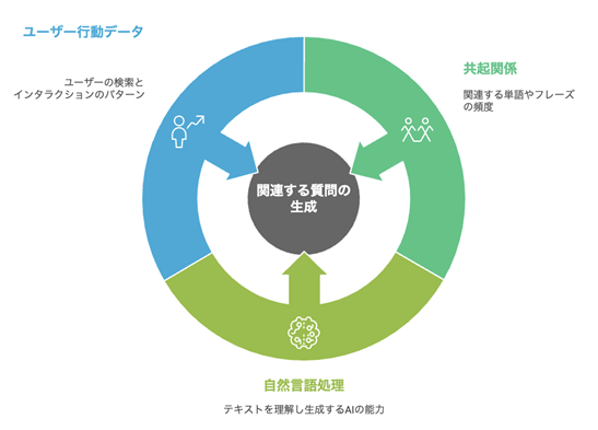 「関連する質問」に出てくる内容は、人間が手作業で作っているわけではありません。すべてGoogleのアルゴリズムとAI(人工知能)によって生成されています。ポイントとなるのは、共起関係・自然言語処理(NLP)・ユーザー行動データの3つです。