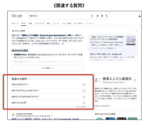 これらのクエリは、検索意図が「理解・判断・行動」に直結するため、Googleはユーザー体験を深める目的で関連質問を提示しやすくなっています。特にAI導入後のGoogle検索では、「質問→答え→別の質問」という流れが明確になっており、関連質問は「「AIモード」時代の会話型検索」への布石だと考えられます。