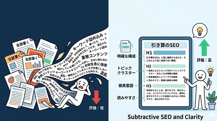 引き算のSEOとは、単に情報量を減らすことではありません。本質は、検索者にとって今いらない情報を、あえて書かないという判断です。