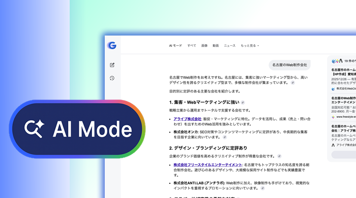 今回は、実際にAIモードで生成された「名古屋のWeb制作会社」 に関する回答内容を冒頭で整理し、それをもとに、
