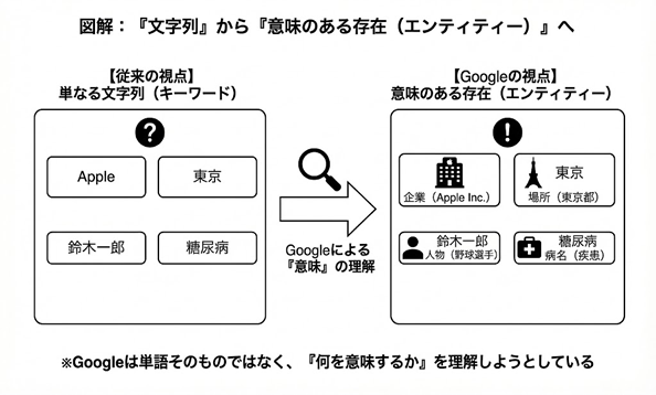 つまりGoogleは、ページに書かれている単語そのものを見ているのではなく、その単語が「何を意味しているのか」「何を指しているのか」を理解しようとしているのです。