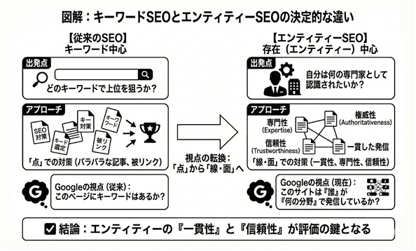 従来のSEOでは、「どのキーワードで上位を取りに行くか」が出発点でした。一方、エンティティーSEOでは、「自分はどの分野のエンティティーとして認識されたいか」が出発点になります。