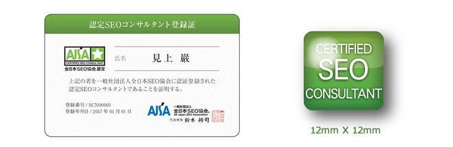 名刺、印刷物、ウェブサイト、その他メディアに自由に認定ステッカーをコンサルタントとしても企業としても表示することが出来ます。またその他ご希望の方には認定SEOコンサルタント紹介ページを作成しますのでご自身の信用アップのためにお役立て出来ます。